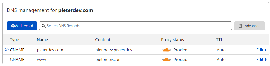 - Create a CNAME record with your current DNS provider to point yourprojectname.com to yourprojectname.pages.dev
