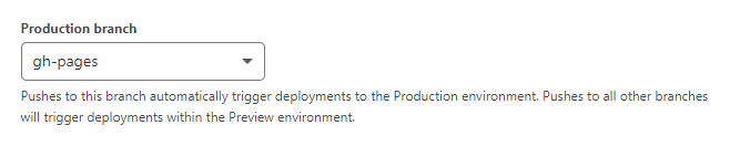 Select the repo you want to use. On the next page, enter a project name which will determine the Cloudflare URL where your site gets hosted. This will not be your domain, we’ll set that up later. Configure the Production branch to be the gh-pages branch that the web page was built to by GitHub Actions: