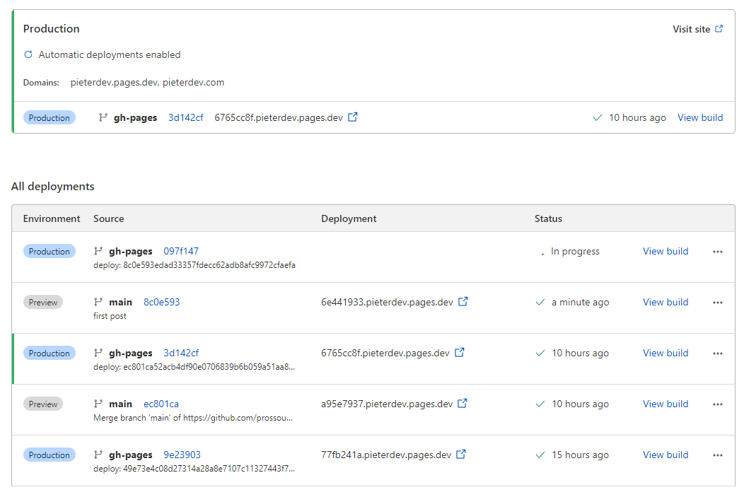 While Cloudflare Pages can build your site from source and Hugo is a supported framework. You can certainly experiment by letting Cloudflare Pages build your Hugo site and eliminate GitHub Actions if you want. I’m using GitHub Actions because the version of Hugo that Cloudflare provides is too old for what my theme requires - so the build fails on Cloudflare and succeeds using this method.