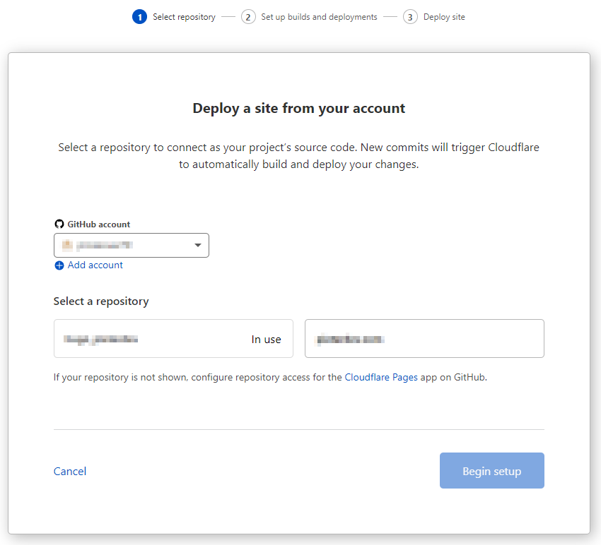 Click on Create a Project, and link your GitHub account to Cloudflare. Be sure to give it access to your repository. Once authorized, your repo should be listed on the Cloudflare page: