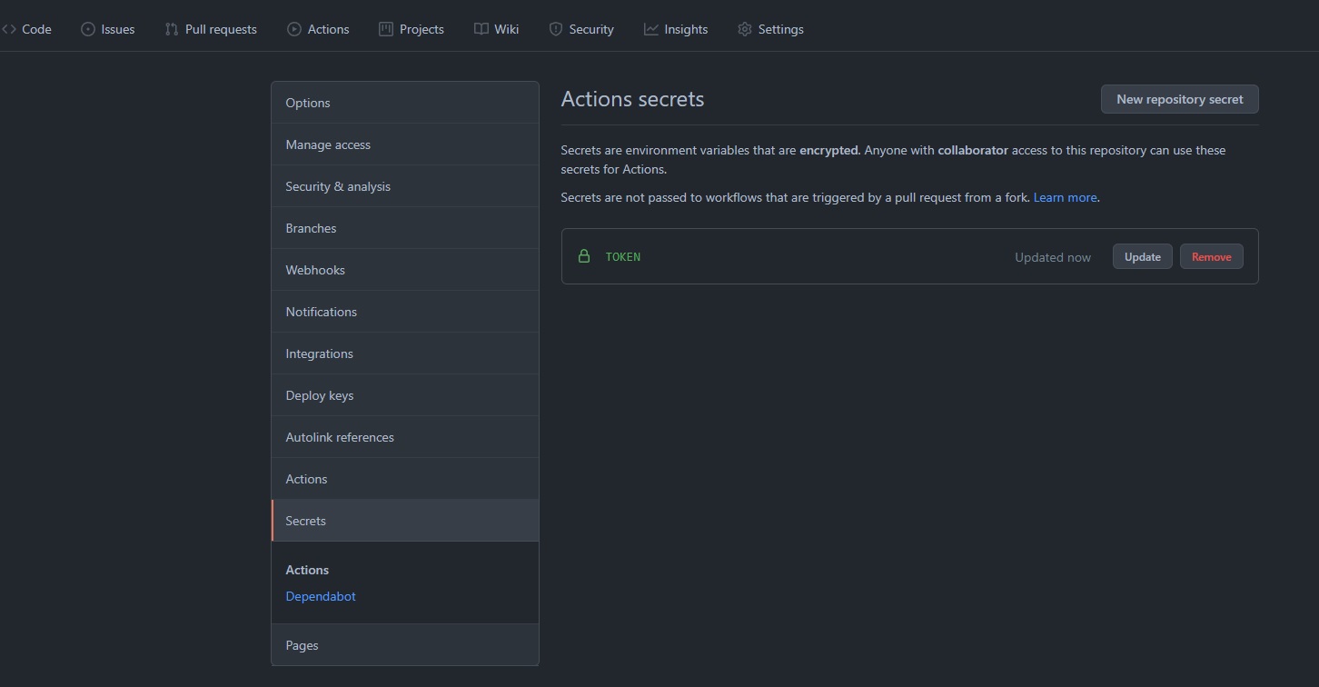 Then go to your repository’s settings page and add a secret called TOKEN: